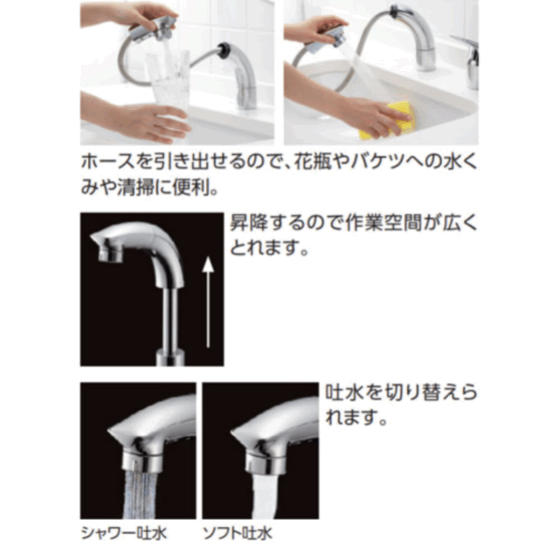 ホースを引き出せるので、手洗いだけでなく洗髪・お掃除にも便利です